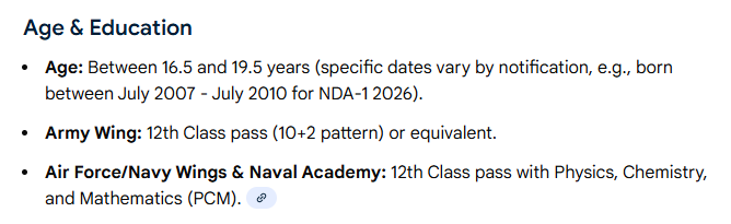 • Age: Between 16.5 and 19.5 years (specific dates vary by notification, e.g., born between July 2007 – July 2010 for NDA-1 2026).